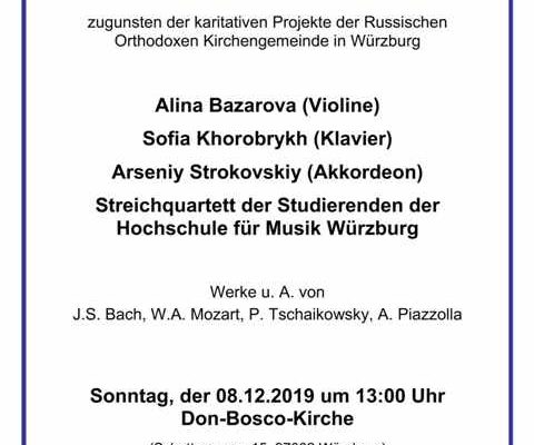 Am Sonntag, den 8. Dezember um 13:00 Uhr geben Studierende der Hochschule für Musik Würzburg Alina Bazarova (Violine), Arseniy Strokovskiy (Akkordeon), das Streichquartett unter der Leitung von Wladimir Kharchenko sowie Pianistin Sofia Khorobrykh ein Benefizkonzert. Sie spielen in der Würzburger Don-Bosco-Kirche unter Anderem Werke von J.S. Bach, W.A. Mozart, P. Tschaikowsky und A. Piazzolla. Der Eintritt ist frei; Spenden für karitative Projekte der Russischen Orthodoxen Kirchengemeinde Würzburg erbeten.