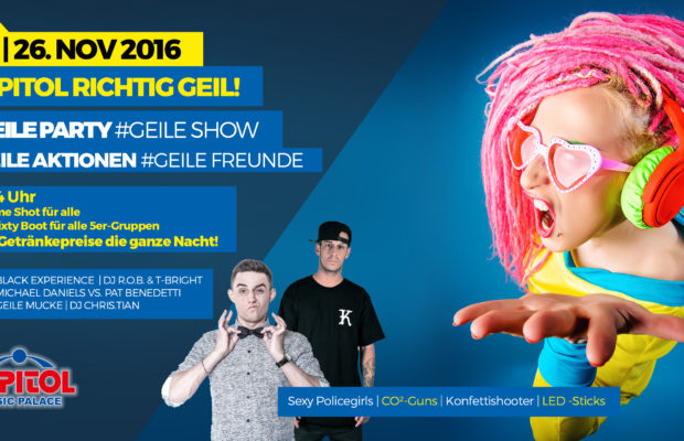 Wir feiern mit euch die geilste Party des Sektors! Mit geilen Shows, geilen Aktionen und den geilsten DJs des Capitols!